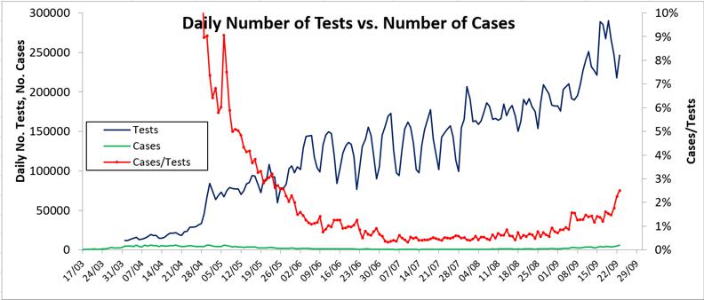 This cases/tests rate get curiouser and curiouser. Having been fairly flat at 0.5% for two months, it suddenly went up to about 1.5% on 6th September and remained fairly flat for two weeks. Now, it has shot up again to about 2.5% in 3 days. Whether it will flatten for a while or not, we don't know.