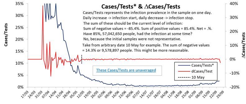You may notice that I have added on yesterday's case results and it has had a significant effect as the cases dropped. The hoped-for measure of those already having had the infection jumped from 7.9m to 9.6m. The present level and inaccuracy of testing provides so much noise that we cannot even see the noise underneath it, let alone what is really going on beneath that.