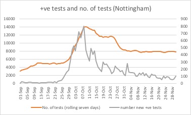 The first chart below shows the positive test rates (right axis) for Nottingham and the rolling 7 day test number (you could replicate the same charts with most university towns / cities)
