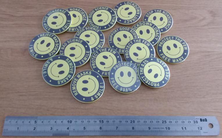 I wear one of my badges (like my avatar) and pin another to my bag ('protect the few - free many'). I have not seen anyone else wearing smileys and I have only had one person ask for one.